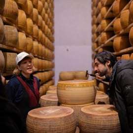 Commencez votre journée dans une fromagerie de parmigiano reggiano, où vous assisterez à la magie de la fabrication du fromage et profiterez d’une dégustation de parmigiano affiné. Vous visiterez ensuite une acetaia traditionnelle, où vous découvrirez les secrets du vieillissement du vinaigre balsamique, avant de participer à une dégustation sensorielle. Visitez ensuite la plus ancienne cave à Lambrusco, flânez dans ses caves historiques et dégustez d’excellents vins régionaux.